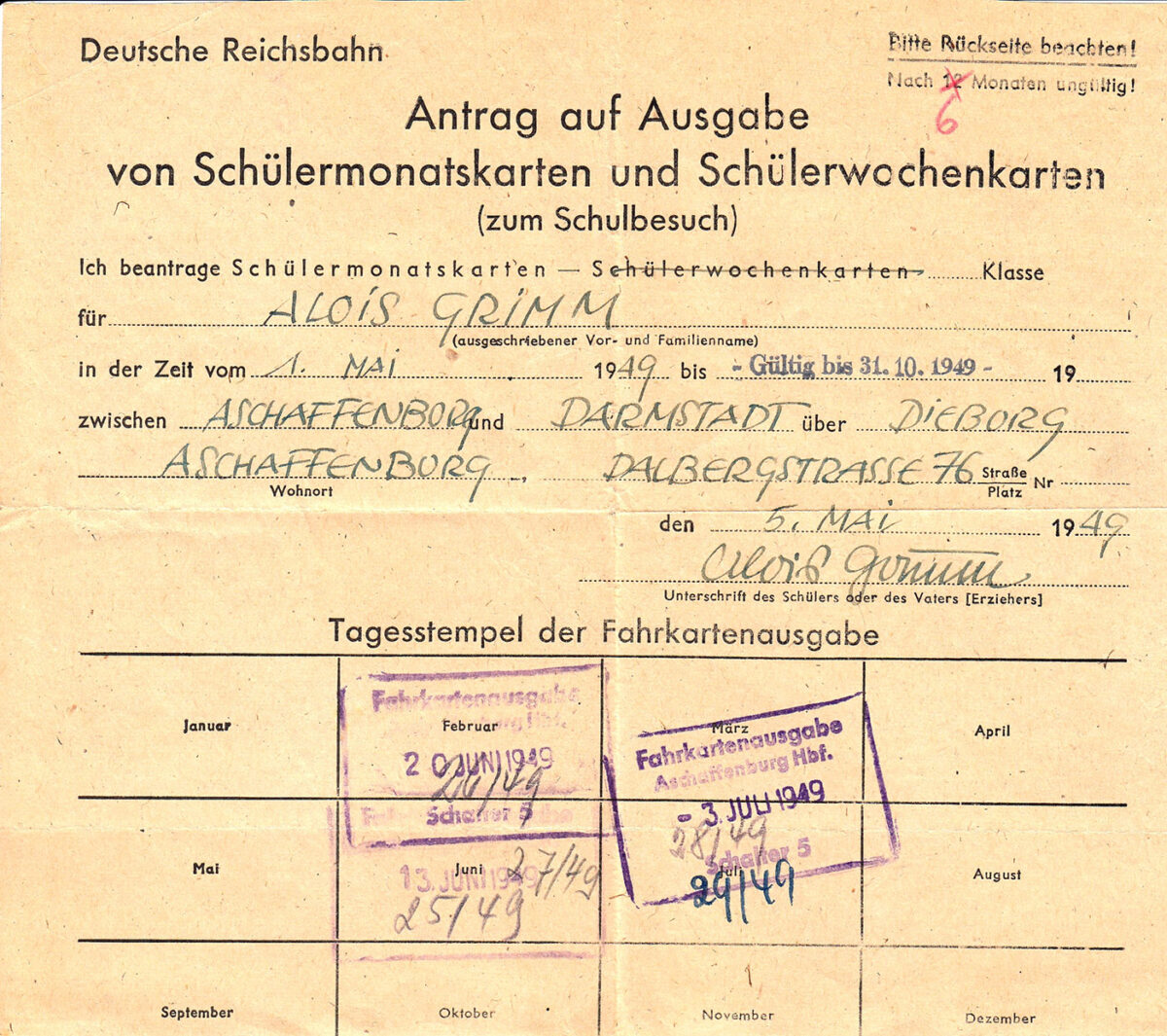 1.5. bis 31.10.1949 Antrag Bahn Monatskarte n Darmstadt
